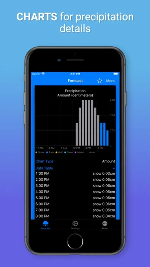 * Hourly Precipitation Charts – If precipitation is predicted on your selected day then hourly charts can display either the percent chance or predicted amount for each hour of the day.