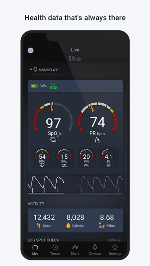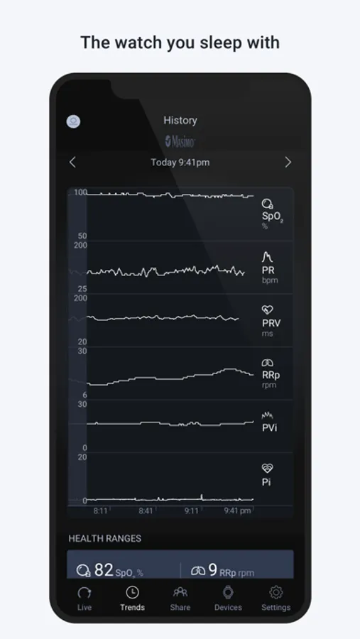 The Masimo Health App is for use with the Masimo W1 watch. This App (together with the Masimo W1 watch) allows you to non-invasively measure the following: