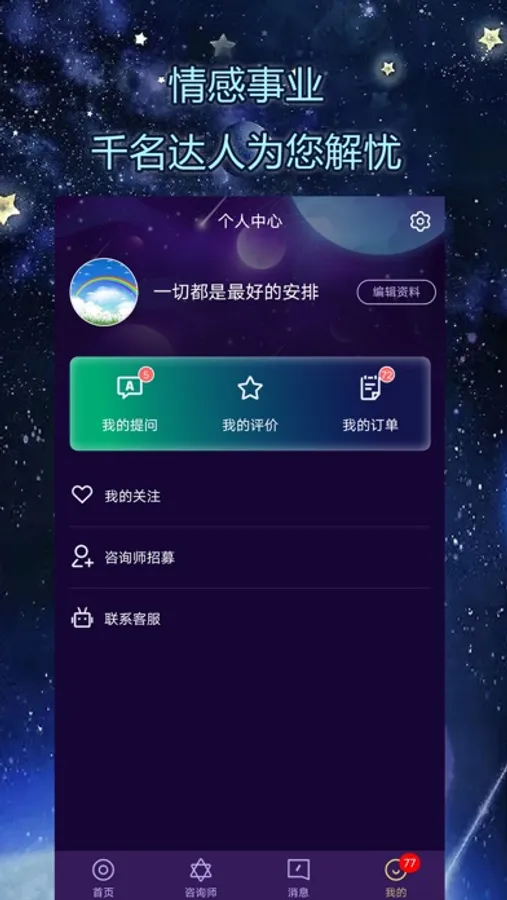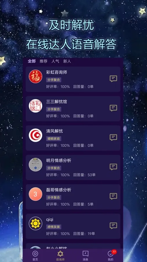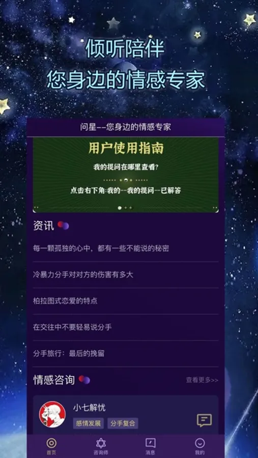 在问星,有优秀的塔罗牌咨询师,占星、星座咨询师,24小时在线为您一对一解答问题,是塔罗牌、星座、骰子爱好者必备的app.