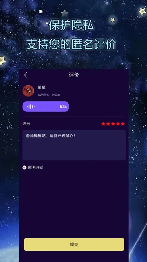 【保护隐私】问星有完善的隐私保护(包括但不限于客户每条评价均可匿名评价)保护你的隐私。