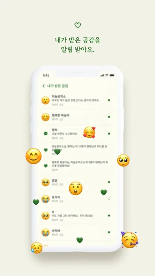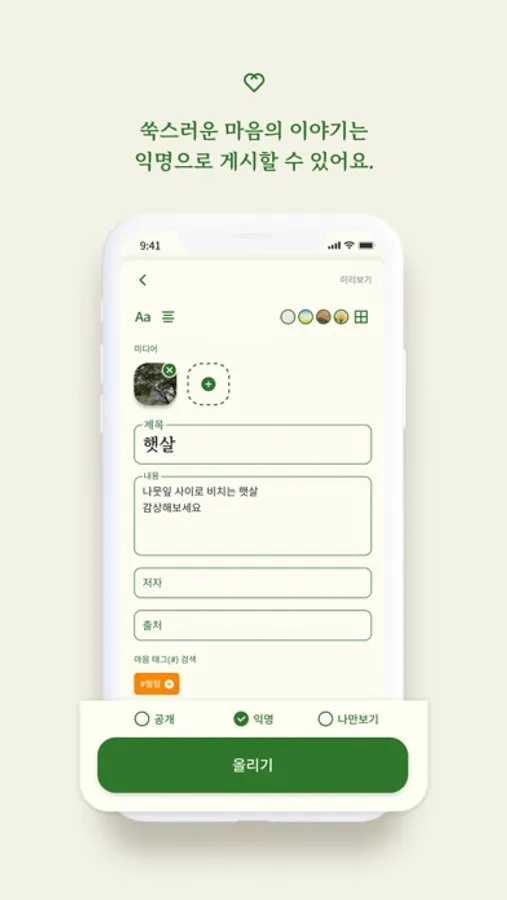 - 쑥스러운 마음의 이야기도 익명으로 게시할 수 있어요.