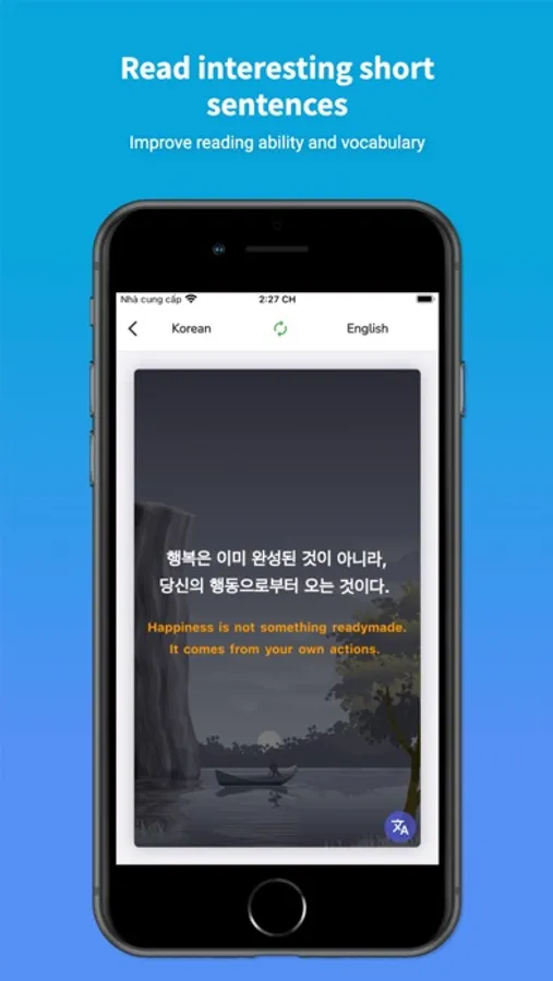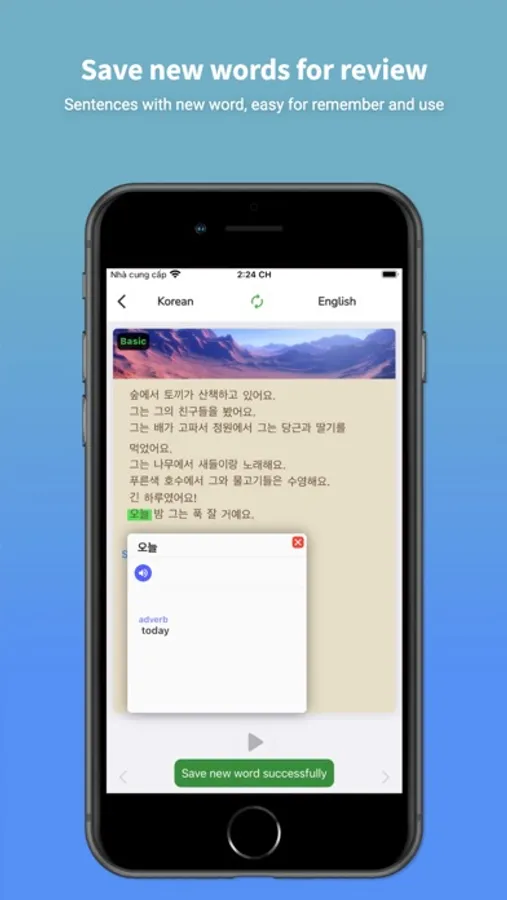 Improve Korean Vocabulary by reading short stories from basic to advanced with english translation, reviewing new word flash cards.