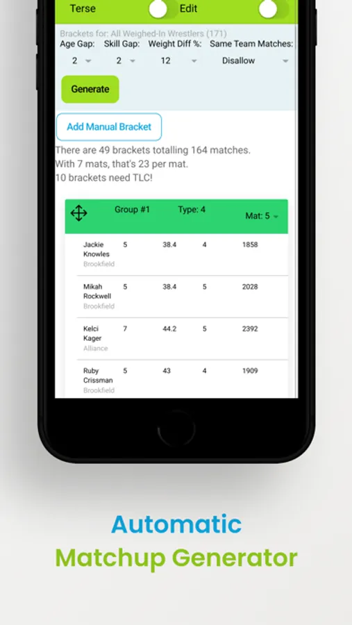 - use our proprietary SNAP rating to automate matchups for the wrestlers. This ensures all wrestlers get the best matches possible, and keeps everyone as safe as possible by enforcing matchup criteria (age, weight, skill).