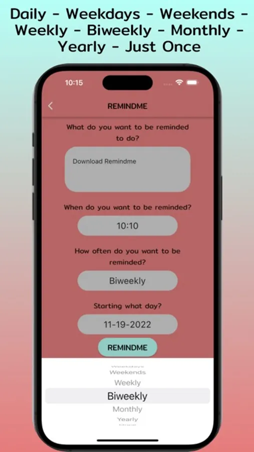 Get reminded daily, weekdays, weekends, weekly, biweekly, monthly, yearly, or just once.