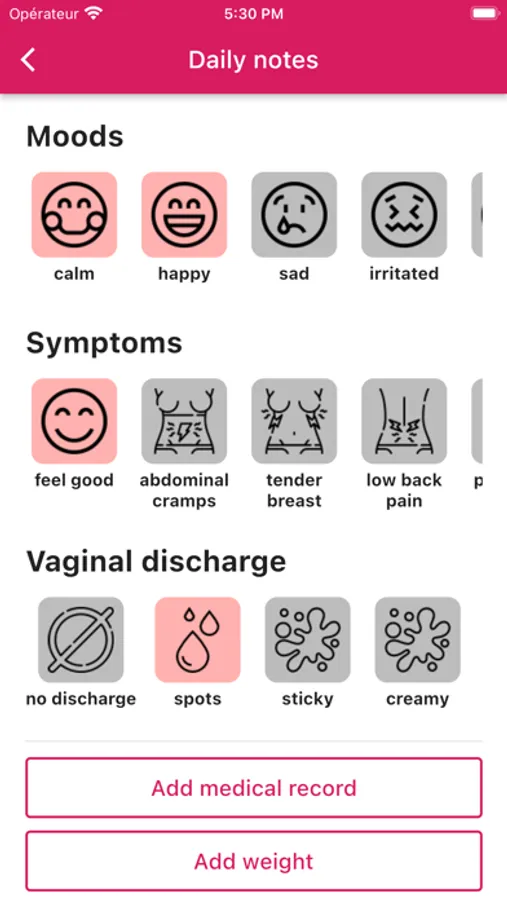 (4) Monitoring your own menstrual cycle, fertility window, contraceptive methods usage, and the correlation between these different elements and your everyday symptoms in one app.