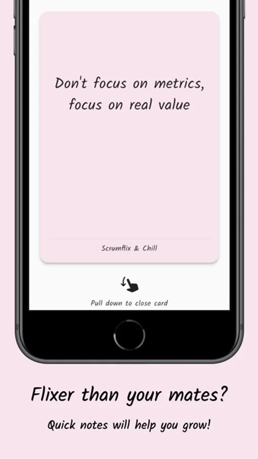 There is no reason for a planning meeting to take forever. Scrum-flix and chill later - together with your team, which makes it even better. Oh, you might be flixer than your mates? Quick notes will help you grow. Personally and as a team. Don't get settled. Be a flixer!