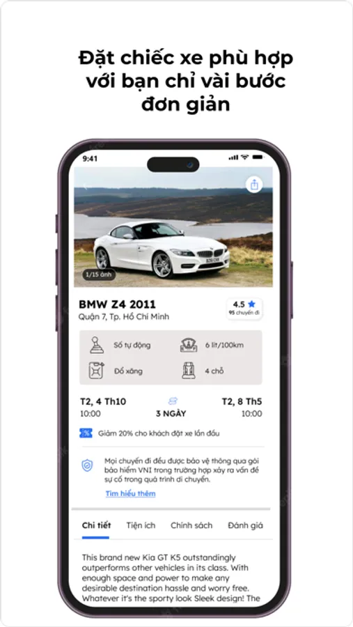 Chọn chiếc xe yêu thích, nhấn “Đặt xe ngay” và đặt cọc giữ xe 30% sau khi chủ xe đồng ý.