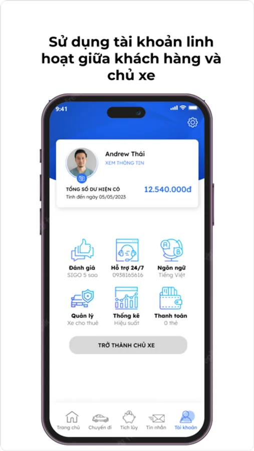 Vào tài khoản chọn mục “Trở thành chủ xe” để thêm xe theo hướng dẫn của hệ thống.
