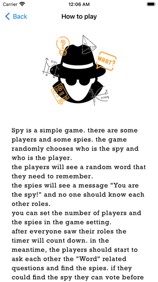 after everyone saw their roles the timer will count down. in the meantime, the players should start to ask each other the "Word" related questions and find the spies. if they could find the spy they can vote before the time runs out if everyone agrees and guessed correctly the players will win. on the other hand, if the spy could do a trick and stay hidden till the time runs out or they understood the "Word" the spies will win.