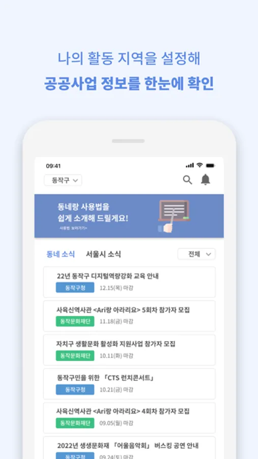 지역별 공공소식을 모아서 확인할 수 있습니다. 시민 지원사업부터 교육과 축제까지, 관심사를 설정하고 나에게 딱 맞는 동네 활동을 시작해 보세요!