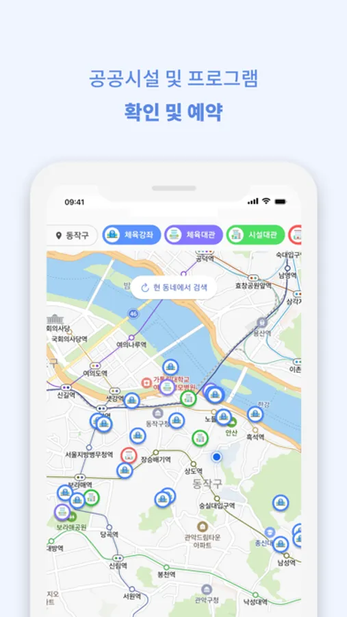 - 동네지도에서 내 주변에 있는 동네 체육시설, 대관시설, 프로그램을 찾을 수 있어요.