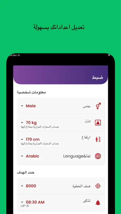 -تنبية على وقت المشي والرياضة .