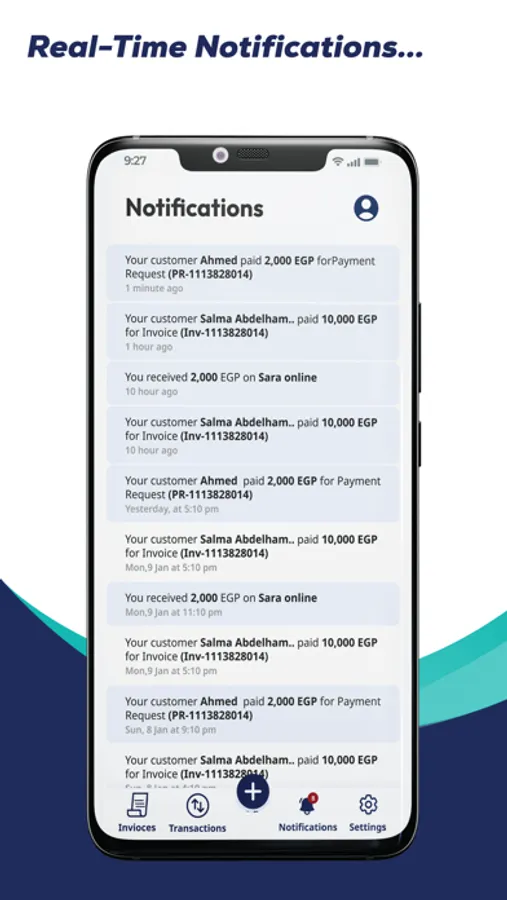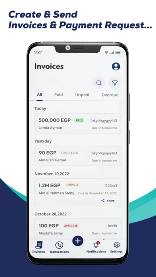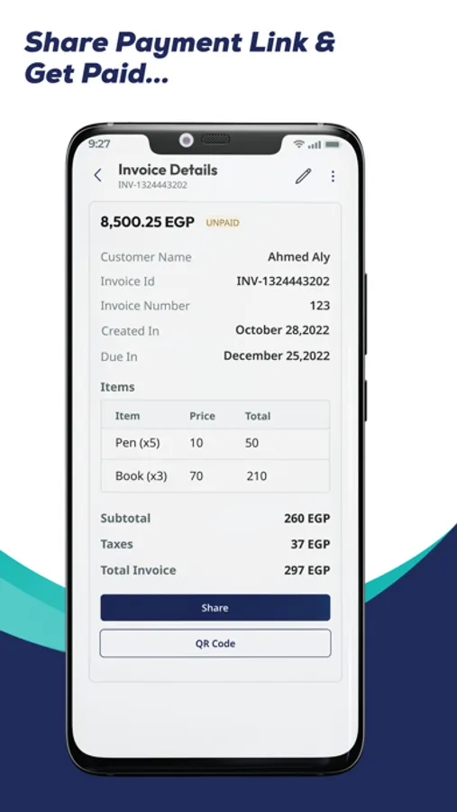 - Create invoices from the app and send it to your customer online via social media, email, SMS or let your customer scan a QR code for the invoice link in case of instore payments
