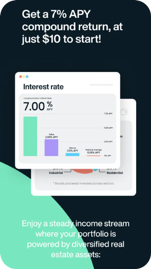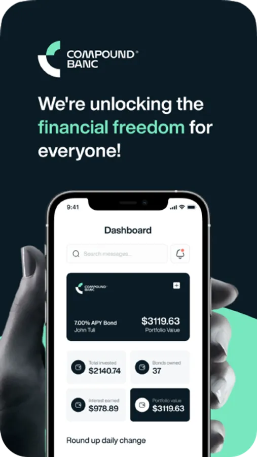 We are unlocking financial freedom for everyone. Get a 7% annual compound return, at just $10 to start! Compound Real Estate Bonds are powered by real estate finance, asset-backed, liquid, and pay a fixed 7% annual compound return. That means higher yields for the everyday person. Compound Real Estate Bonds is a financial technology company, not a bank. We’re making financial products more inclusive and accessible. We are a next generation customer centric company. We have unlocked financial freedom for all by building a simple secure financial ecosystem where your money can grow and move freely. Withdraw your money at any time. No lock-ins. No commitments. No hassles. Enjoy a steady income stream where your portfolio is powered by diversified real estate assets. Real assets. Real returns. NO crypto NO stocks NO NFTs Automating your savings has never been so easy. Use “Round-Ups” on everyday purchases to convert spare change to a $10 bond. Auto Pilot Savings Set your recurring savings and make a habit out of investing . Try $ 10 a day and start the secret of Compounding. With Compound Bonds your money makes money, then makes more money.
