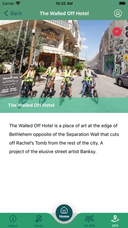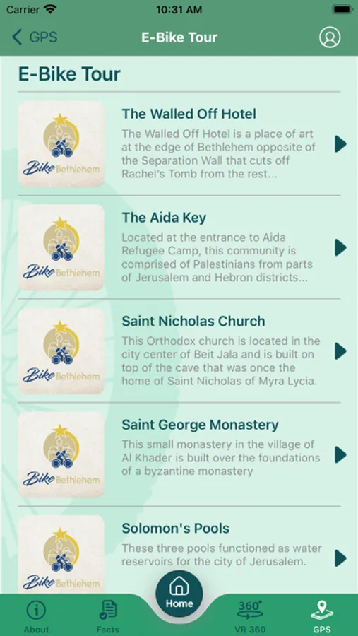 E-Bike Bethlehem is an App that provides tourists visiting the governorate of Bethlehem with a virtual tour through a selection of the area’s most mesmerizing places. The App is also a promotional tool to the E-Bike service provided by a local tourist center and contains a lot of useful information about the city of Bethlehem and its neighboring area.