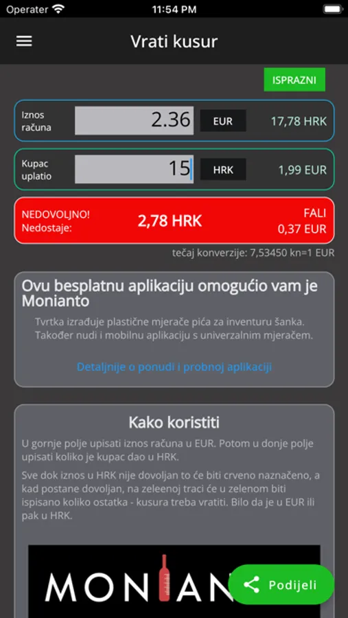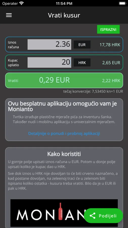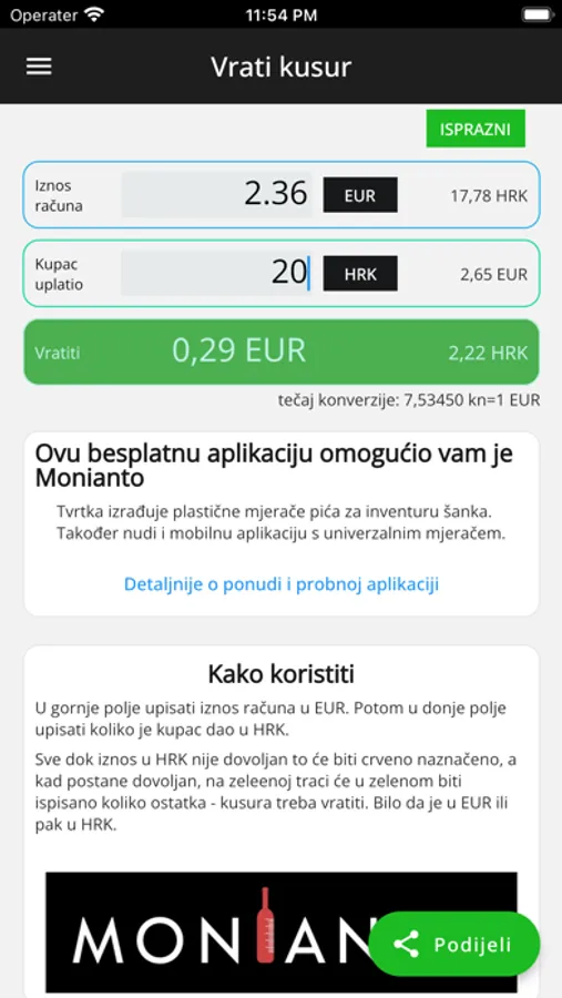 Preračun EUR u HRK uz izračun ostatka u HRK
