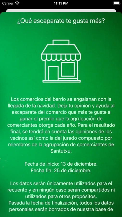 Para el resultado final, se tendrá en cuenta las opiniones de los vecinos a través de la App así como la del jurado compuesto por miembros de la agrupación de comerciantes de Santutxu. El resultado se dará a conocer a través de los canales de comunicación de la agrupación de comerciantes y también a través de la App.