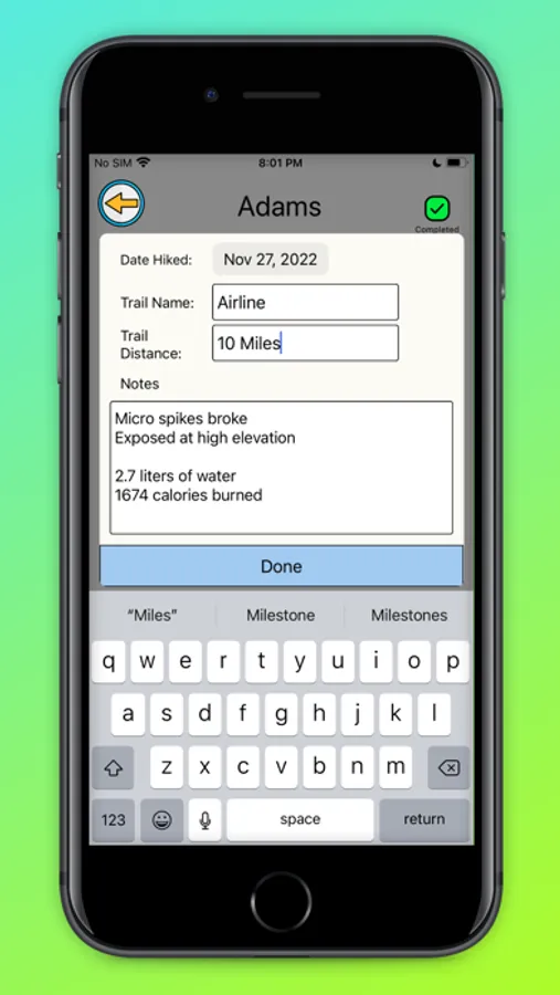 Features date, trail name, trail distance, notes, and completion recording - None of this information is uploaded to any online servers, and only saved in app's local files.