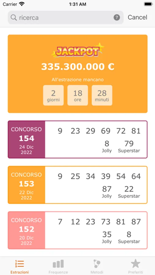- Controllare i numeri estratti di estrazioni precedenti inserendo data o numero del concorso