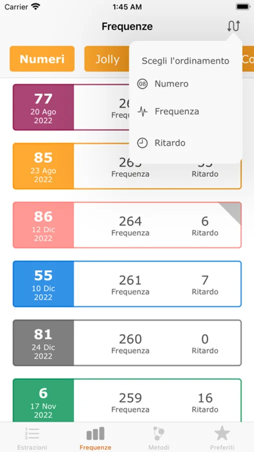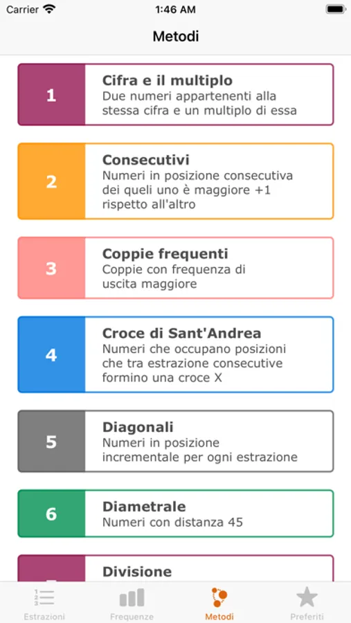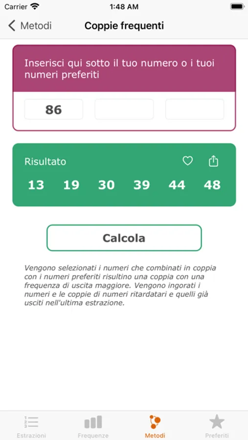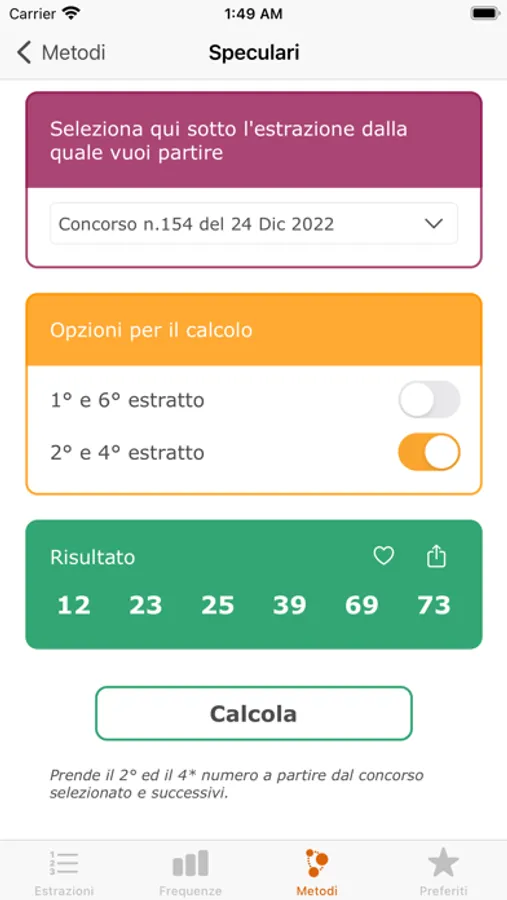 - Individuare il Metodo di calcolo migliore evidenziato nell'app con una spunta laterale e il numero di estratti più frequente