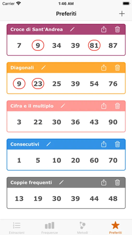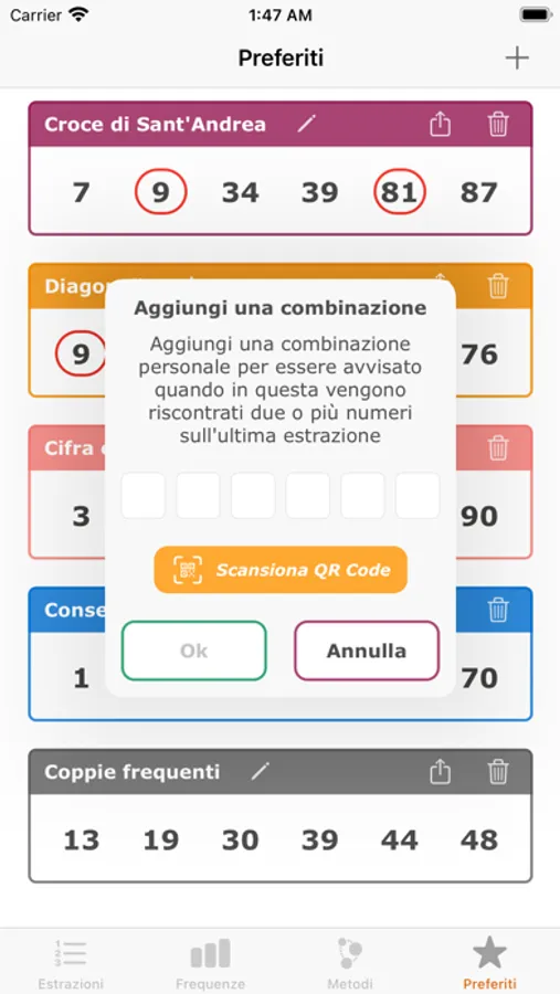 - Salvare le combinazioni preferite per essere avvisato quando nell'ultima estrazione vengono riscontrati due o più numeri estratti appartenenti ad una tua combinazione preferita