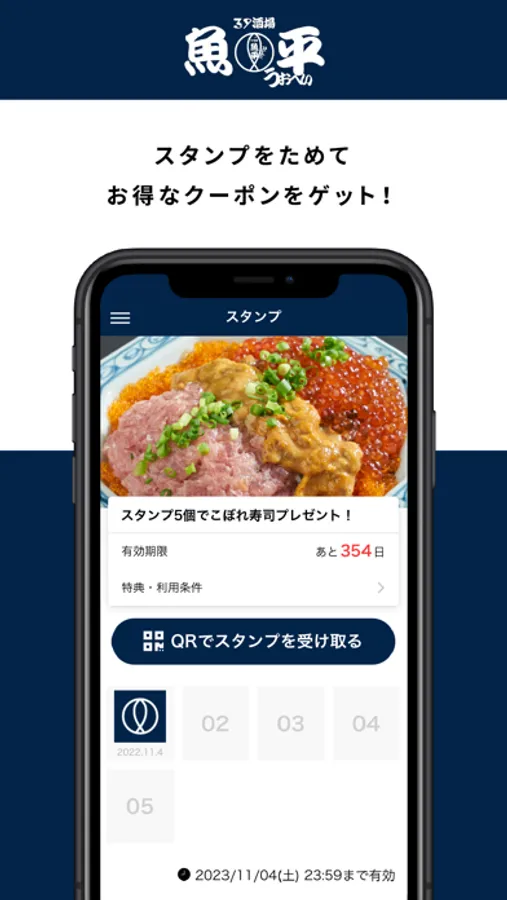 アプリ内にはスタンプカード機能も搭載! 「39酒場 魚平」のご利用でスタンプがたまると、 お得なコンプリートチケットが発行されます。