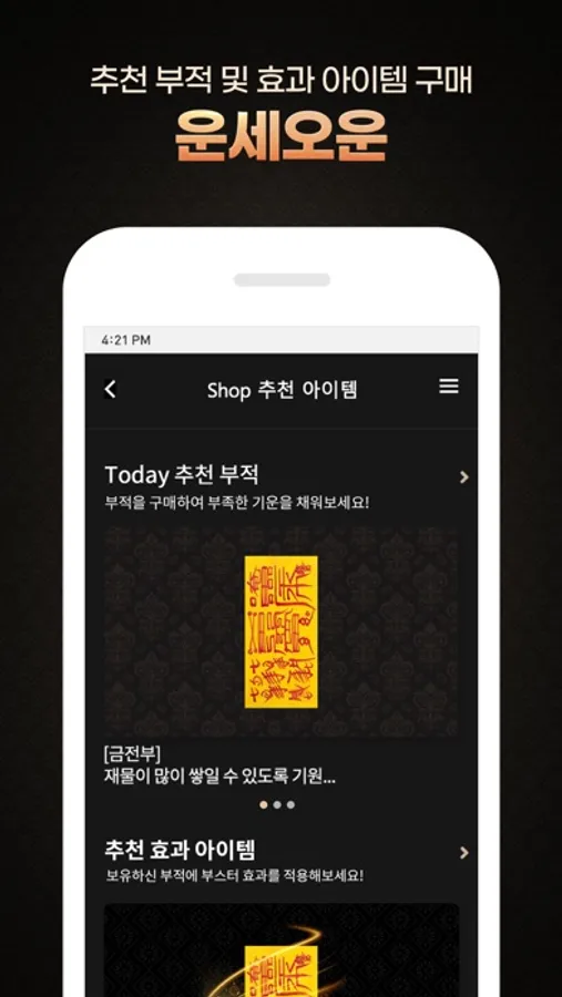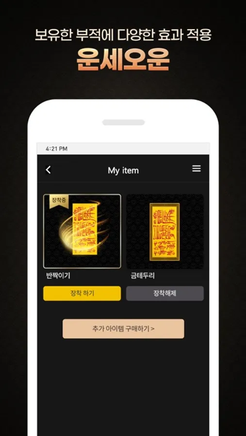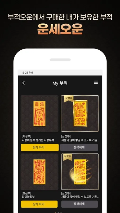 부적오운에서 구매하신 부적을 장착하여 행운의 기운을 더해 보세요.