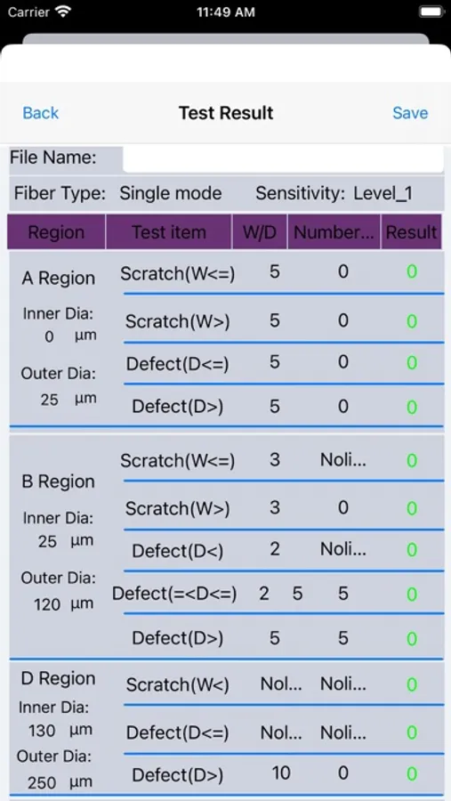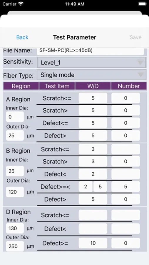 TorchFiberCheck app is a software specially developed for Tongqi handheld optical fiber tester. Its functions include receiving wifi videos, displaying videos, setting test parameters, and testing the cleanliness of optical fiber end faces. Before starting the app, please turn on the power key and wifi function key of the handheld optical fiber tester, then turn on the wifi function in the settings of the phone, find the wifi name of the enabled handheld optical fiber tester and connect it. Now you can open the TorchFiberCheck app. At the top of the app is a drop-down selection box for camera type and a drop-down selection box for files;The middle main area is the video display area; The bottom is the function button area, which is respectively the test button, the test result button, the parameter setting button and the photographing button. Click the test button, and the app will capture a clear picture in the video, analyze the picture, and display the analyzed picture in the video display area.After the test result comes out, the test result button function will be enabled, and clicking it will enter the test result display interface.The parameter button can be used to set the test parameters of the end faces of different optical fiber models.The photo button can capture the currently displayed video.