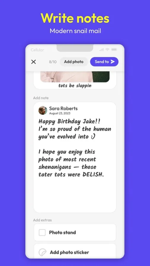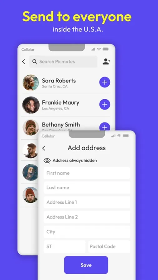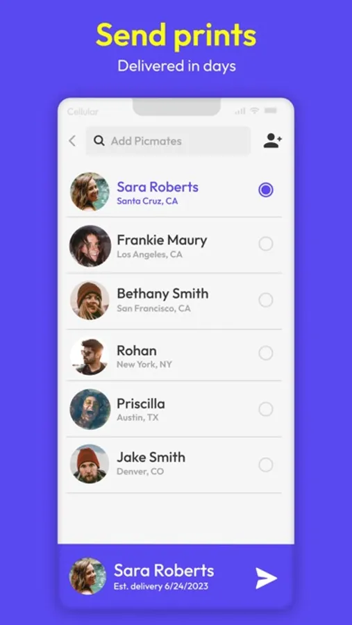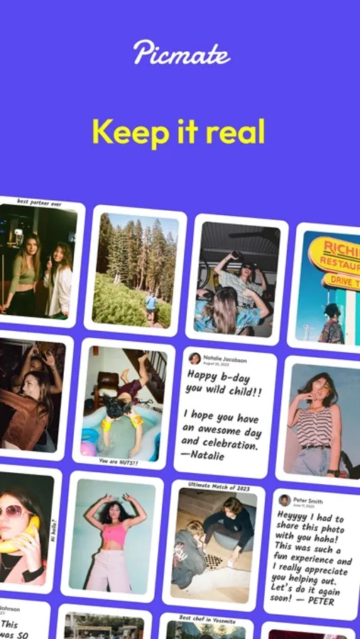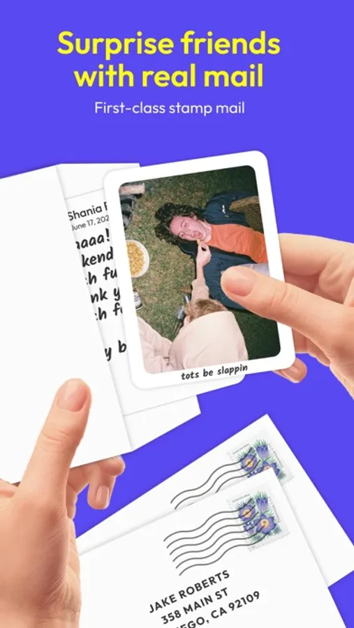 Picmate is the easiest way to send photo prints directly to your friends mailbox. Surprise your favorite people with old-fashion stamp mail and precious keepsakes — sent in seconds. Connect with your friends and loved ones in real life. Open your mailbox to find envelopes filled with photo prints and thoughtful notes from your favorite people. Deliver joy to loved ones, send a birthday card, a thank you card, recent photo moments, or just a casual greeting to remind them you care. Share stories in real life.