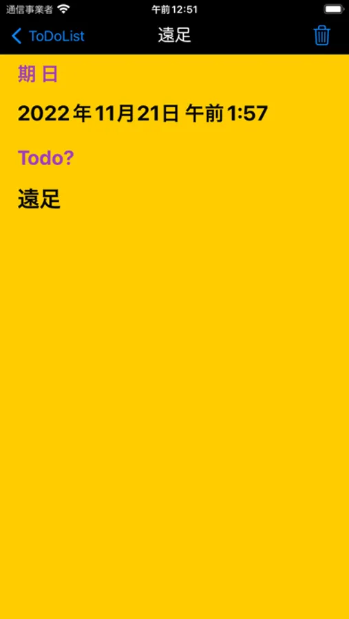Todoリスト画面からイベントをタップすると詳細画面で内容を確認して、もし完了していればゴミ箱ボタンで簡単に消去できます。