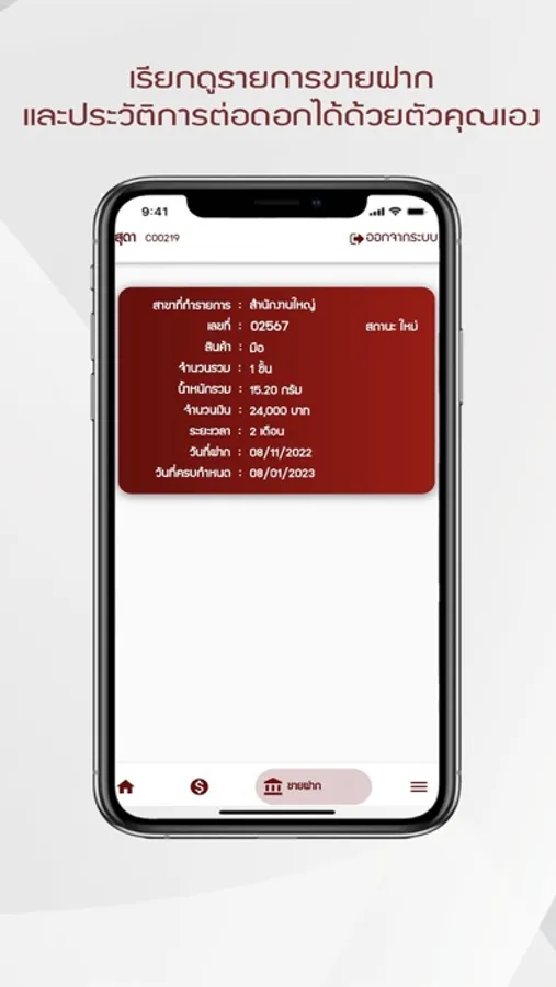 • เพิ่มความสะดวก สามารถเช็คยอดออม คะแนนสะสม และรายการขายฝากที่เราทำธุรกรรมกับทางร้าน