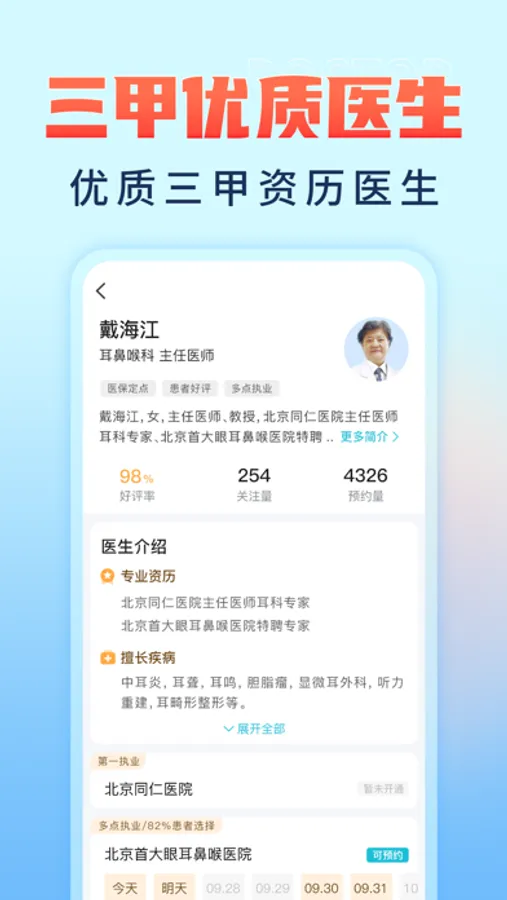 京号通APP致力于北京地区医院快速预约挂号、诊前咨询、互联网诊疗、复诊开药等一体化大健康服务。平台严格审查医院医生资质信息,筛选优质医院医生入驻,目前已覆盖北京近百家医院,涵盖1000余位优质专家医生,精准的为用户匹配最适合的医生。避开长时间排队,快速就医,享受高效优质的医疗服务。互联网诊疗将使全国用户不出家,通过手机直接与专家医生在线沟通咨询疾病,药品邮寄到家,免去长途看诊患者身心俱疲的压力。让互联网科技助力人民健康,让更多患者摆脱疾病困扰是我们持续改进的目标。(本平台不对诊疗的选择及效果承担任何责任,在您做出任何诊疗决定之前,需要寻求线下医生的建议。)