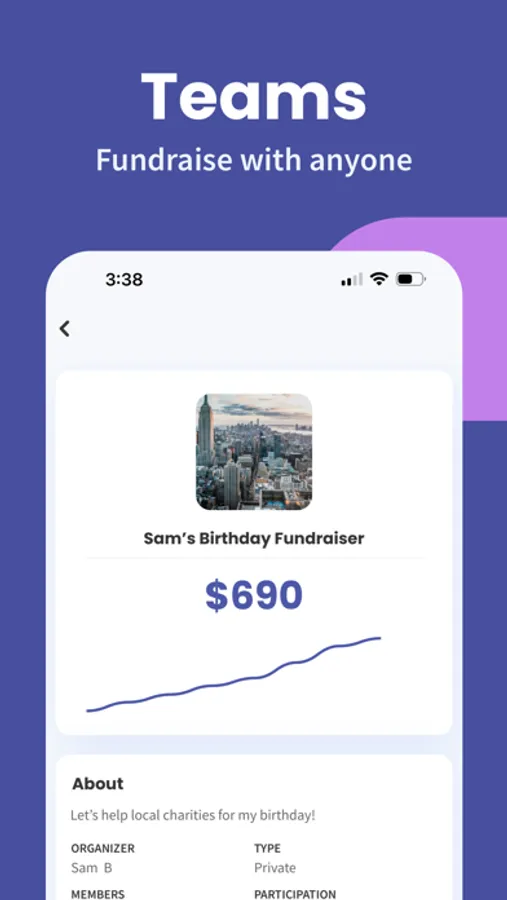 Create a Giving Team for any reason, with anyone! It's simple to create and invite friends, family, coworkers, classmates, everyone to join. Raise money for one organization or let team members showcase the charities they connect with. Compete with team members or other teams to see who can do the most good