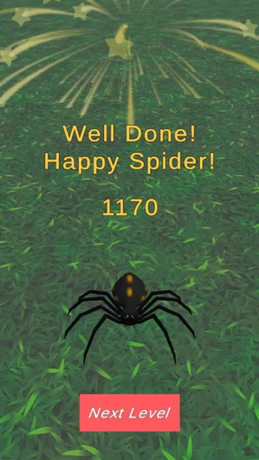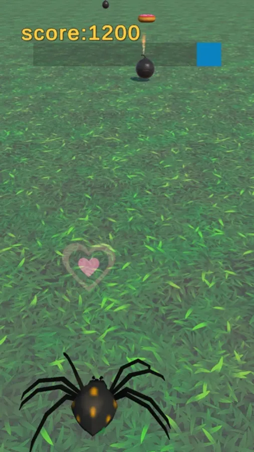 The aim of the game is to guide the spider to eat as many sweets as possible, whilst avoiding the bombs. The spider can move left, right, forward and back by touching the screen, and will automatically run forward. If the spider collides with a bomb, it looses points.