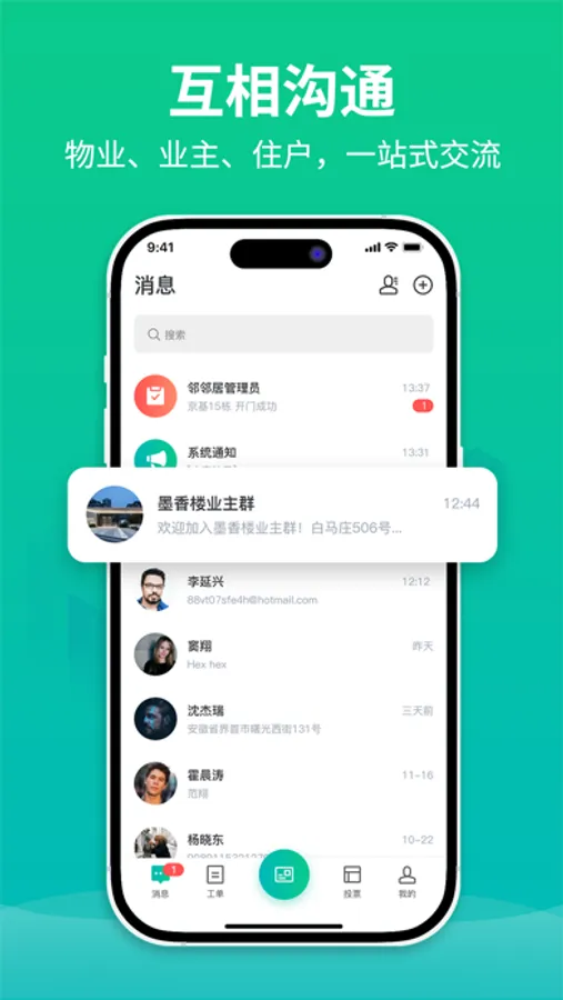 线上交流:一站式消息触达,大大提高物业的办公效率,满足物业员工群体内部以及和小区业主之间的沟通协调。让人与人、人与家、家与家紧密连接,为共建美好小区一起齐心向前。