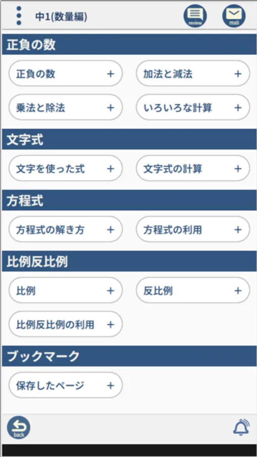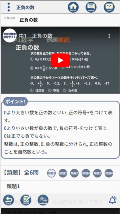中学1年数学の正負の数, 文字式, 方程式, 比例反比例の授業動画と練習問題による学習アプリです。