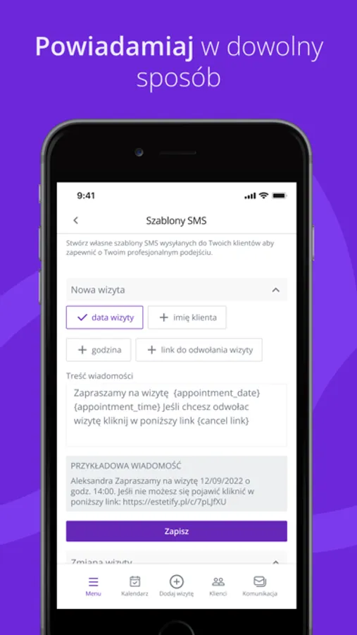 - Powiadomienia i przypomnienia SMS - Powiadom klienta o zapisanej wizycie i automatycznie przekaż szczegóły rezerwacji. Decyduj o formie i treści przesyłanych wiadomości. Personalizuj i wykorzystuj zmienne takie jak imię i nazwisko klienta, data wizyty i wiele innych,
