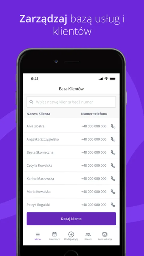 - Baza usług i klientów - Grupuj usługi i ustalaj ceny. Dodawaj klientów, zapisuj szczegółowe informacje. Miej wszystkie ważne dane w jednym miejscu,