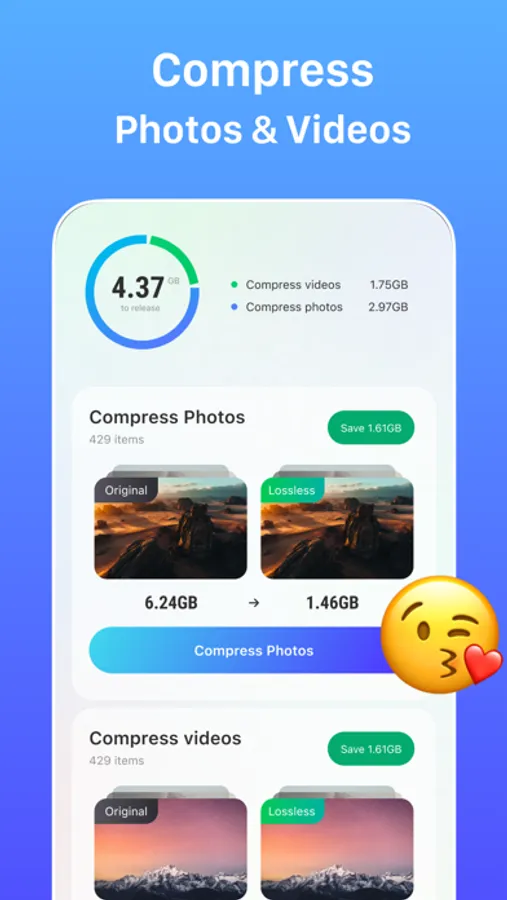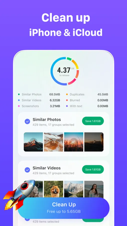 - Intelligent recognition and cleaning: duplicate photos, blurred photos, similar photos, screenshots, similar videos and large videos