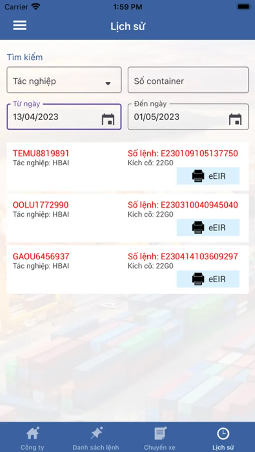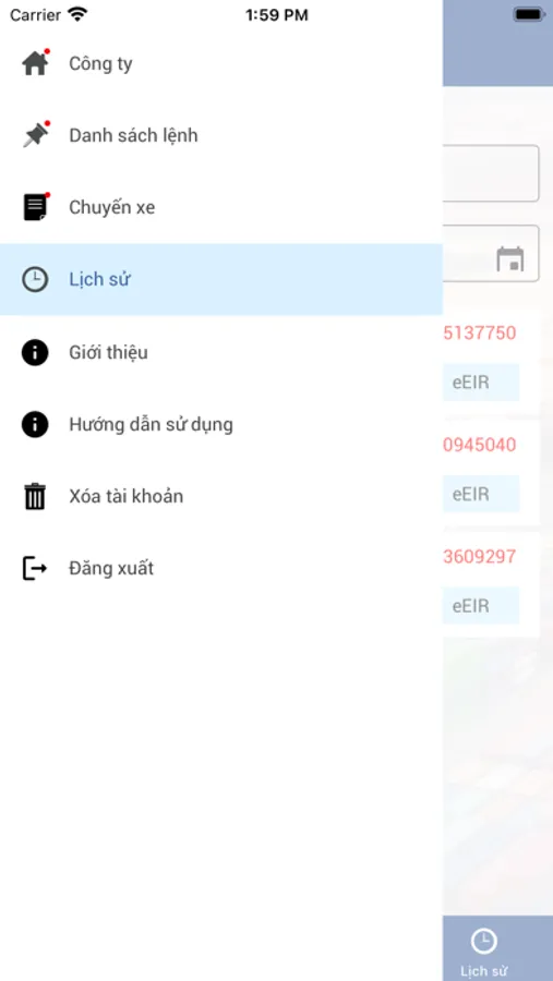 - Lịch sử: xem các lệnh đã hoàn tất, in phiếu giao nhận điện tử eEIR.