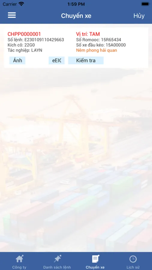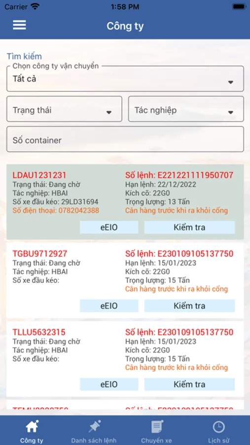 - Bên cạnh đó, Lái xe kiểm tra các container đã đủ điều kiện vào cảng hay chưa (thông tin chưa đủ điều kiện được hiển thị chi tiết), hoặc có thể xem chi tiết lệnh eEIO từng container.