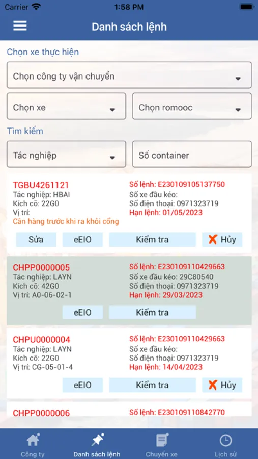 - Công ty: hiển thị danh sách lệnh của công ty vận tải đang quản lý tài khoản lái xe, lái xe được phép chuyển sang lệnh của tôi