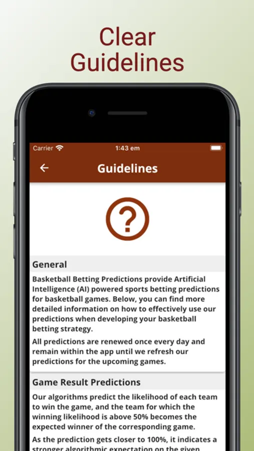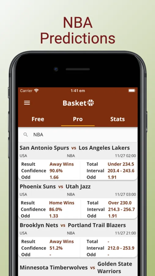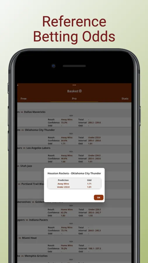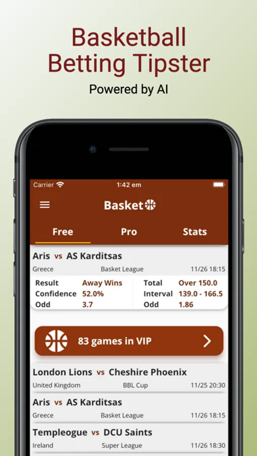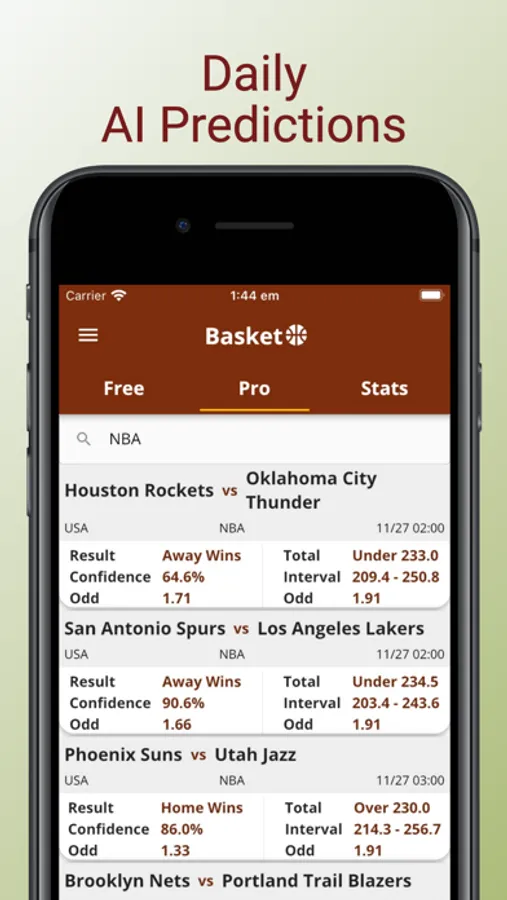 Our AI algorithms generate the likelihood of each basketball team to win the game that will be played. These predictions are probabilistic and shared as a percentage figure for each team. Since there is always a winner in basketball games, the team having a winning probability that is greater than 50% is the expected winner based on our algorithms. Our algorithms expect that a given game is riskier for betting when these probabilities are close to each other (say 48% and 52%). As the winning probability increases and gets closer to 100% for a given team, it indicates a stronger confidence on the prediction for that team to win the game. Whenever it is possible, reference odds are made available as well from bookmakers for each game result prediction.