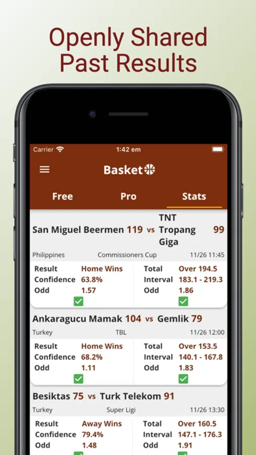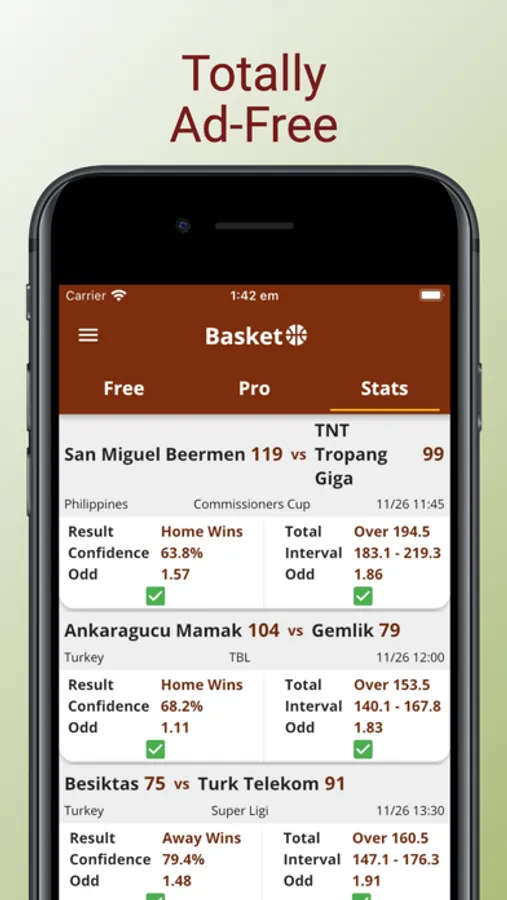 Beside game result predictions, we even share total score predictions for each game. It is very challenging to be very accurate on total score predictions so that beside the total score prediction, we even share a prediction interval for the total score itself. For example, if the total score prediction is – say – 180 for a given basketball game, our algorithms also provide an interval i.e. the total score of the game is expected to be between 168 and 192. In this way, you can try to pick the best bet for total score betting for basketball games. Whenever it is possible, reference betting odds are made available for total score predictions as well in our mobile app.