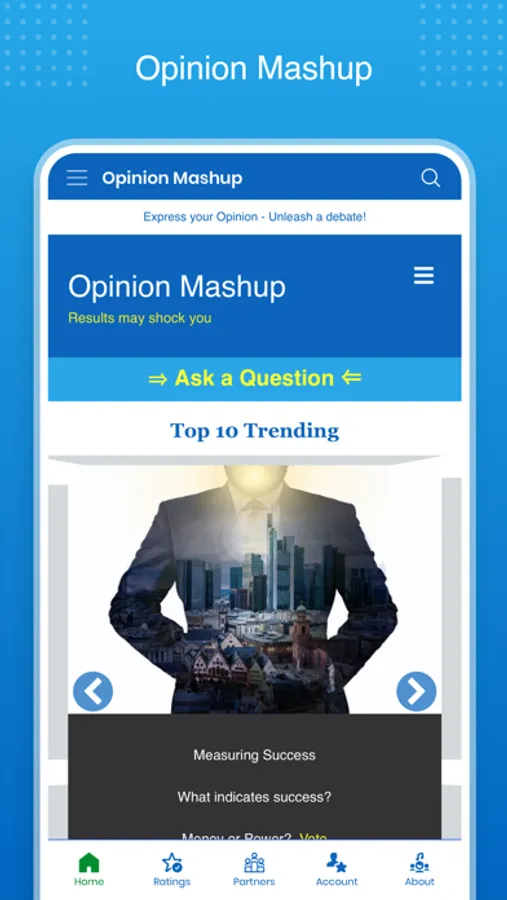 “Simplicity is the ultimate sophistication”. Opinion Mashup is simply the ultimate destination for public inclination inquiries. The free app enables the public to craft unique entertaining and empowering surveys that trigger critical thinking. Users can analyze and deduce instantly from results. Sign up for membership, build groups, spark debates, inspire followers and observe trends. It is a simple, entertaining, empowering and innovative alternative to traditional media. Select topics are developed into social media videos and the authors are rewarded. The app is designed to accommodate diverse partnerships including personalized hubs. Go to Partnership Programs to learn more.