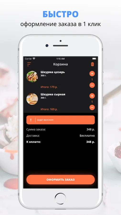 Скачивайте наше приложение, оформляйте заказ и наслаждайтесь любимой едой, где бы Вы ни были! Приятного аппетита!