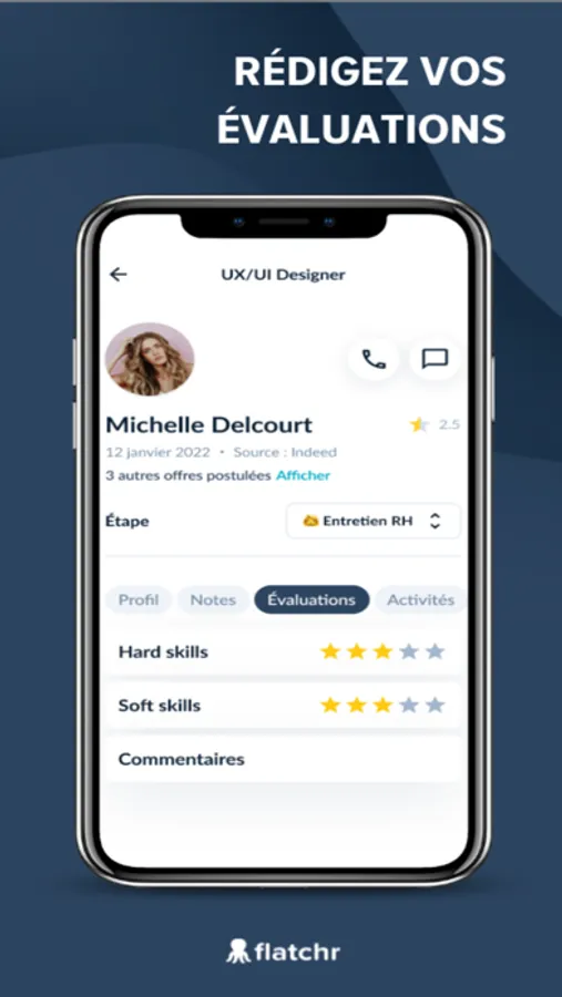 • Évaluez les profils des candidats et ajoutez les retours d’entretiens directement depuis votre téléphone