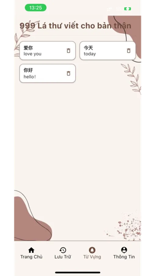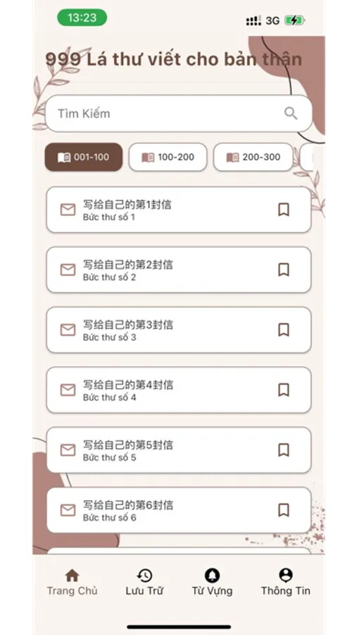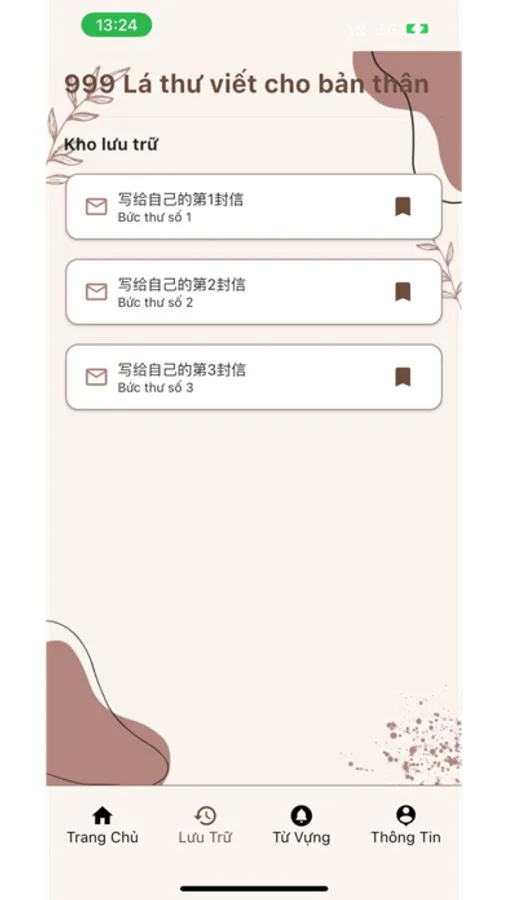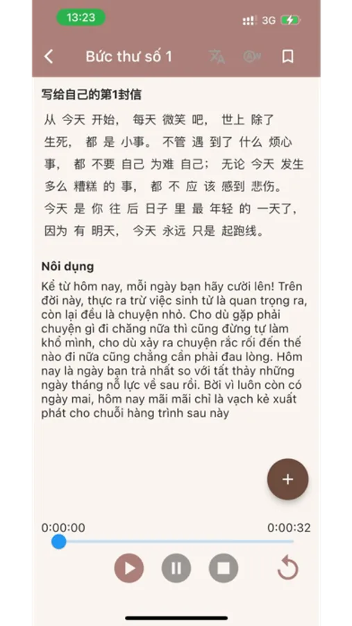 Thông qua việc sử dụng ứng dụng, bạn có thể xem cụ thể nội dung và phần dịch của từng lá thư, nghe audio, và lưu từ vựng.