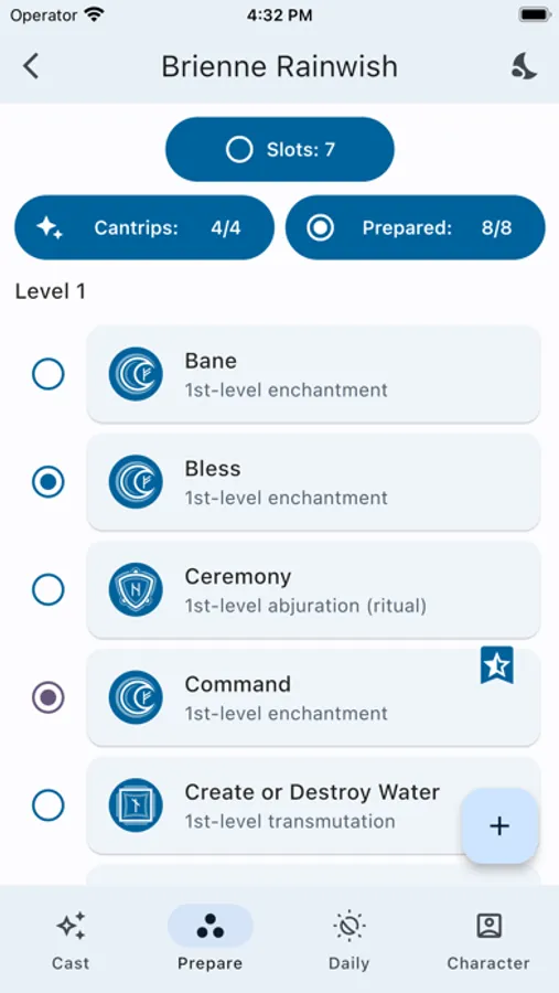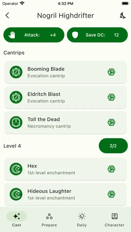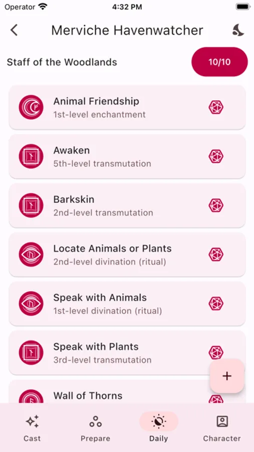 *MANAGING SPELLS: All the necessary spells from your classes and subclasses are automatically added, and the rest you can add and manage yourself in the 'Prepare' tab.