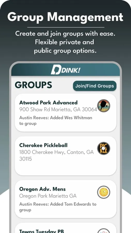 - Group Management: Invite and manage groups of players, making it easy to schedule games with your regular pickleball friends or to meet new opponents in your area.